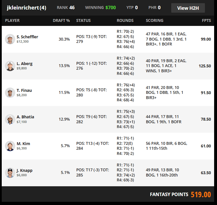 Regardless, the week was a success and many subscribers had great weeks. I myself was a few putts away from the big bucks, with a 46th finish in the 47,000 entry big $20. Even my mother had big lineups cashing.