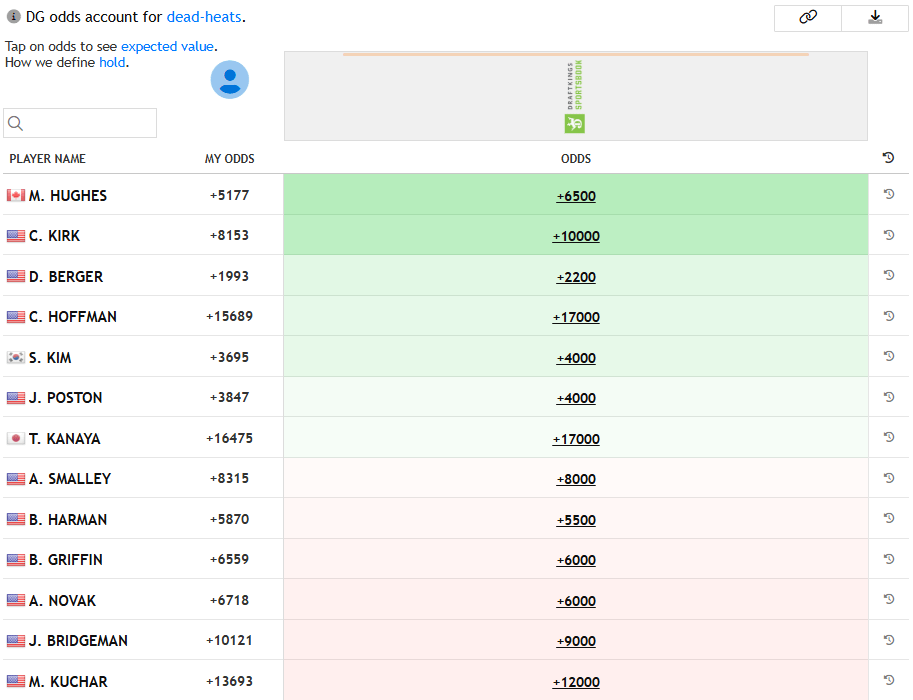 My odds shown below via the datagolf.com Custom Model tool