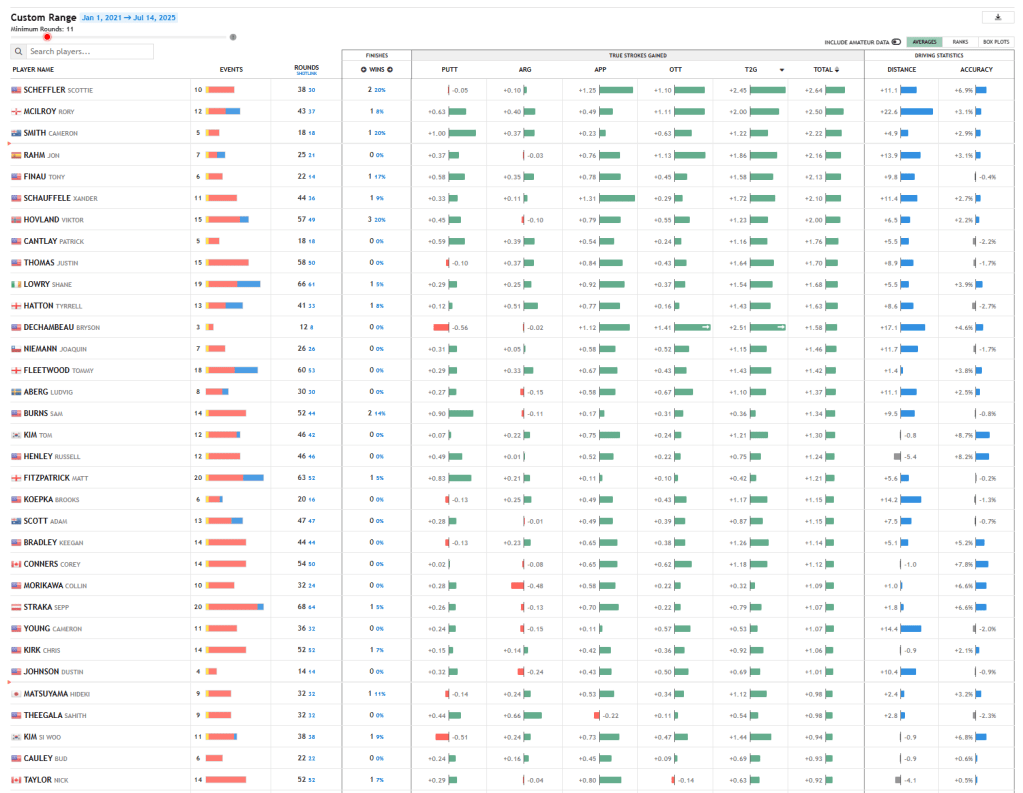 Below is a strokes-gained-adjusted query from 1/1/2021 onwards at the corollary courses listed above, created on datagolf.com. It’s a wide sample across years but gives you perspective to who has played best.