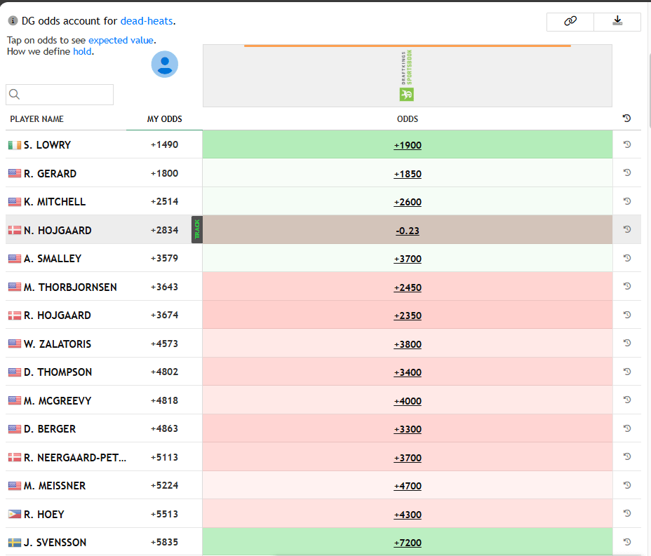 My odds shown below via the datagolf.com Custom Model tool